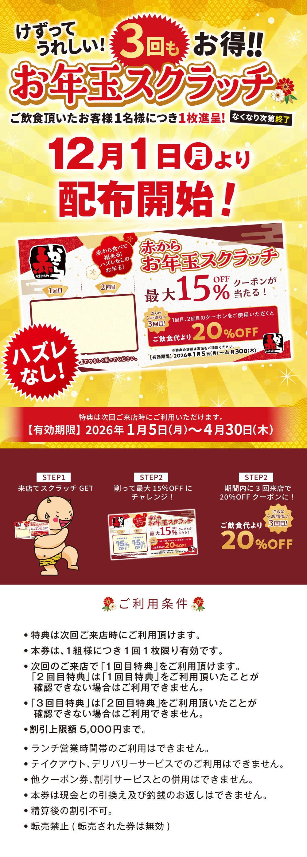 年末年始のお楽しみ企画、今年もスタート! 12月1日(月)からご来店のお客様に1人1枚“お年玉スクラッチ”をプレゼント。 運が良ければ 最大15%OFFクーポン が当たるかも! さらに期間内に 3回ご来店で20%OFFクーポン にランクアップ。 全国の赤からで開催中!数量限定のため、お早めに!